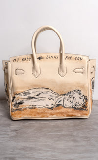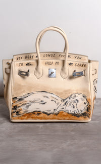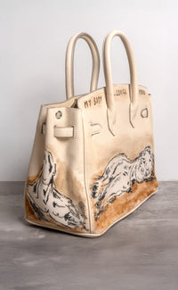 Large light cream vegan leather handbag with hand painted white artwork by Patrick Church. Includes Cross Body Strap. Each order is hand done and artwork may vary slightly.