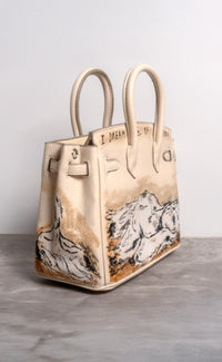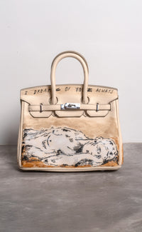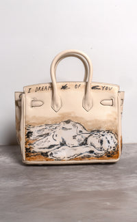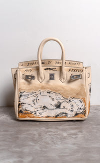 Medium light cream vegan leather handbag with hand painted white artwork by Patrick Church. Includes Cross Body Strap. Each order is hand done and artwork may vary slightly.