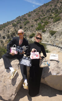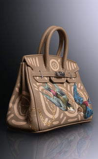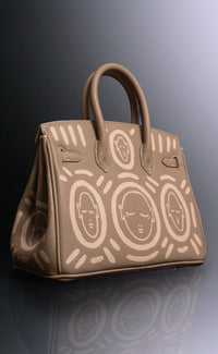 Medium taupe leather handbag with hand painted artwork by Patrick Church and Ruby Quilter. Includes Cross Body Strap.