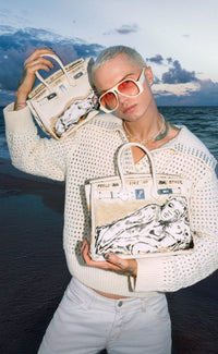 Small light cream vegan leather handbag with hand painted white artwork by Patrick Church. Includes Cross Body Strap.