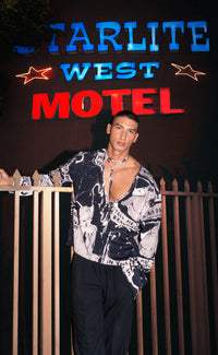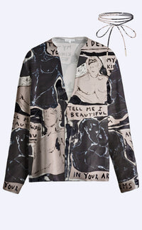 A lightweight long-sleeve V-neck shirt paired with a removable wrap-style necklace. Featuring new artwork by Patrick Church from his I Tried series—raw, romantic, and quietly sexy.